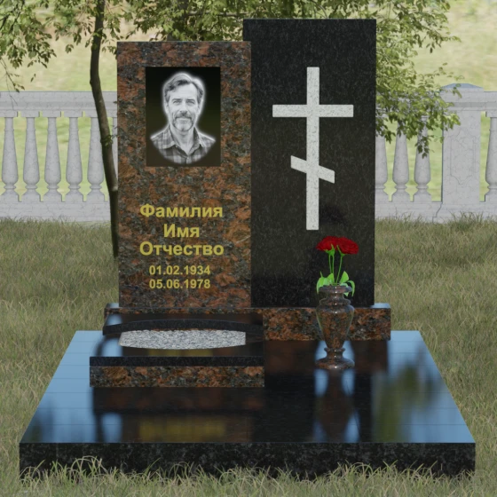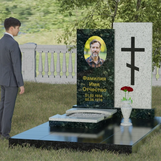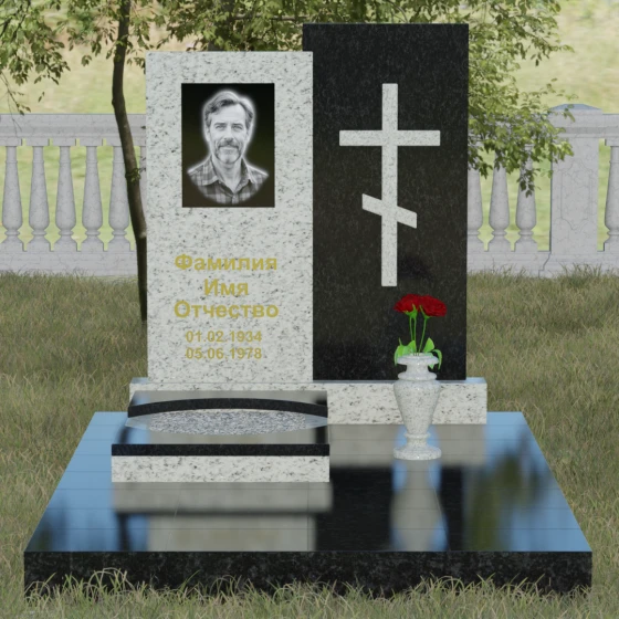 Данная модель представляет собой сложную двухкомпонентную конструкцию, построенную на гармонии противоположностей. Основной вертикальный элемент разделен на две части разного цвета и фактуры. Левая панель, выполненная из темного, глубокого камня, предназначена для центрального акцента — портрета и мемориальных надписей. Благодаря идеальной гладкости, гравировка здесь выглядит максимально четко, а портрет обретает фотографическую точность и одухотворенность. Правая часть композиции — это блок из светлого камня, на котором располагается лаконичный православный крест. Крест выполнен в строгом черном цвете, что создает мощный визуальный контраст на светлом фоне, подчеркивая духовную чистоту и значимость символа веры. Геометрия модели подчеркнуто строгая: прямые линии и четкие грани символизируют твердость характера и прямоту жизненного пути.