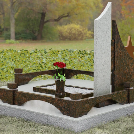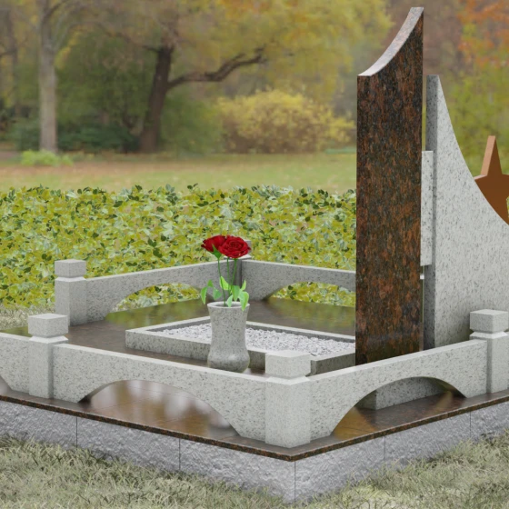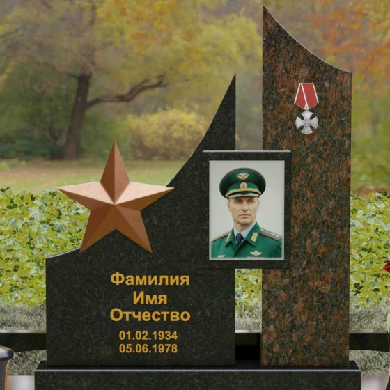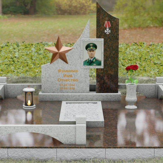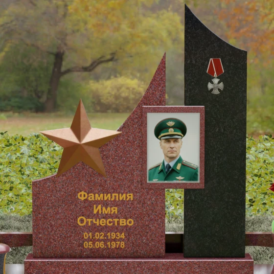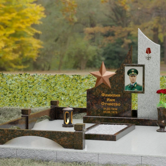 В основе художественной концепции лежит динамичная асимметрия, которая придает всей структуре современный, «европейский» облик. Центральная стела состоит из двух контрастных блоков, объединенных общим основанием. Левая часть, выполненная из темного полированного камня, имеет резкий диагональный срез, направленный вверх. На ее вершине закреплена объемная пятиконечная звезда с эффектом бронзового напыления — мощный акцент, подчеркивающий статус и заслуги покойного. Правая часть композиции представляет собой высокий вертикальный пилон из фактурного коричнево-красного гранита, на верхнем сегменте которого расположена детальная реплика ордена Мужества.