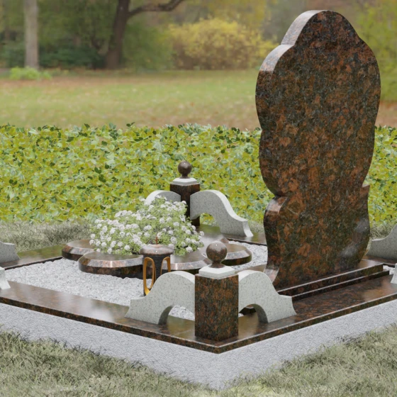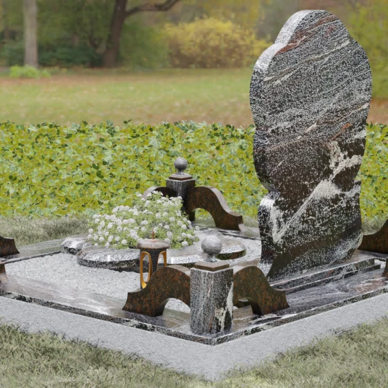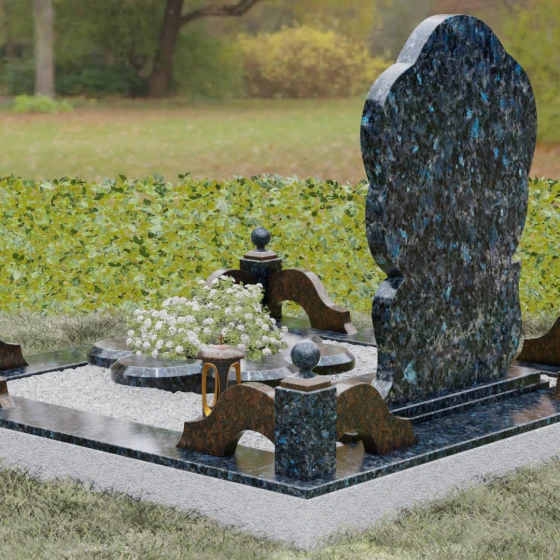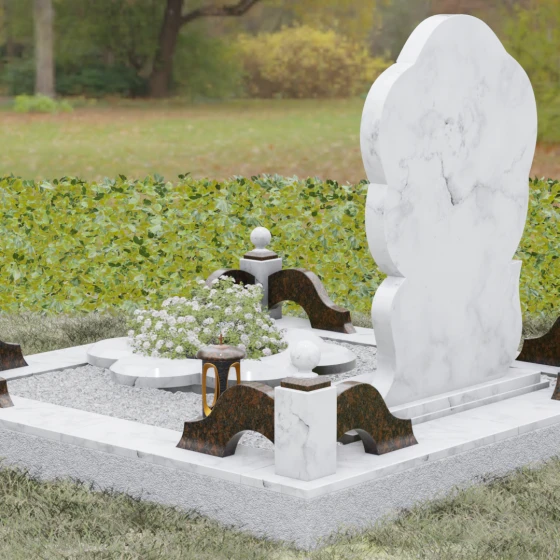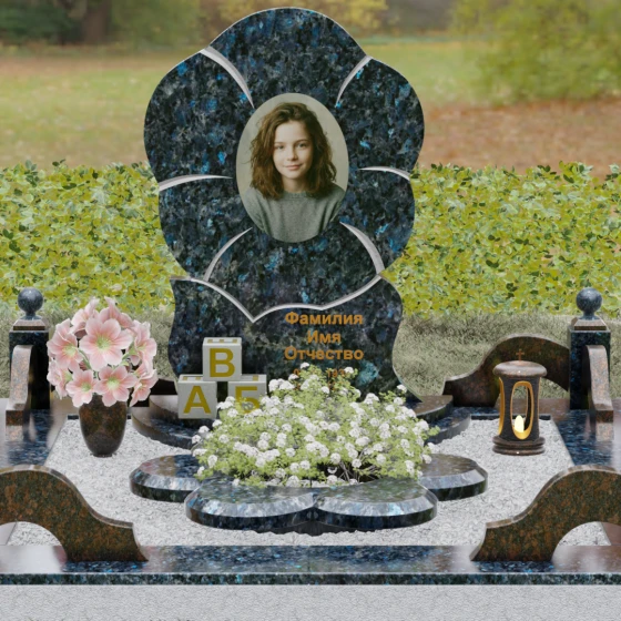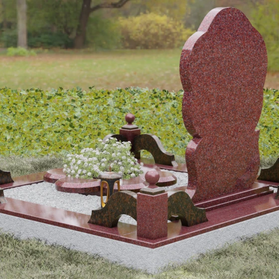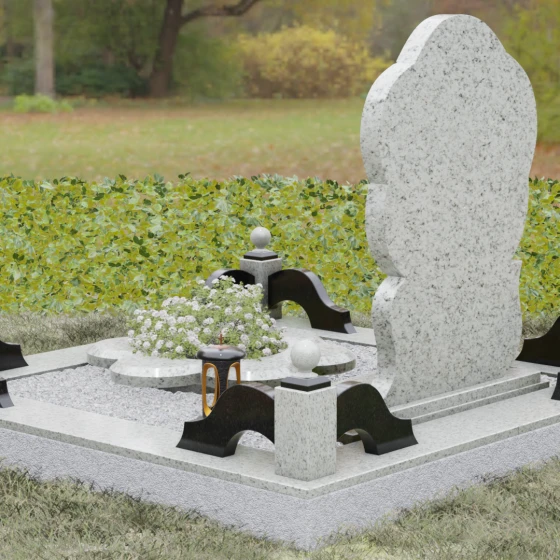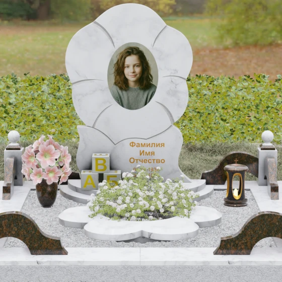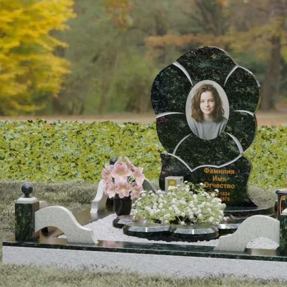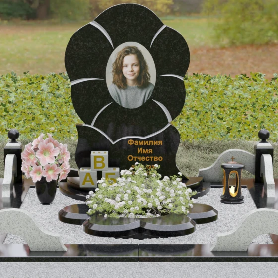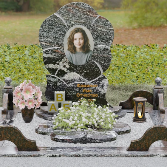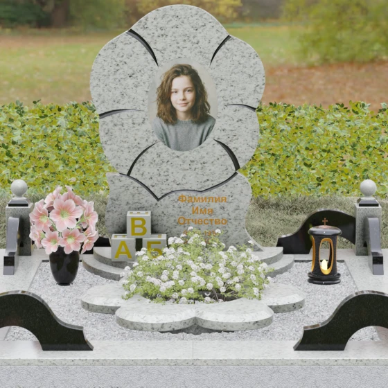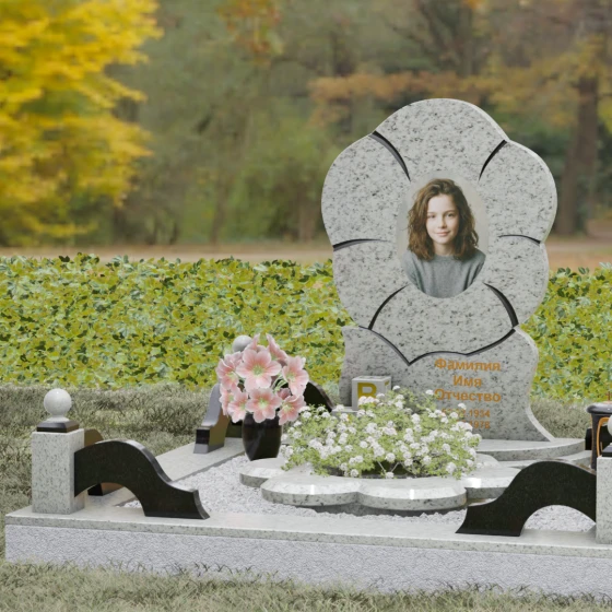 Каждая деталь этого проекта наполнена глубоким смыслом. Цветок в мемориальной пластике традиционно символизирует чистоту души, её расцвет и вечную весну в ином мире. Плавные, текучие линии боковых граней олицетворяют покой и отсутствие земных тревог. Декоративные резные блоки у основания напоминают о начале жизненного пути, о безмятежности и искренности, что делает эту модель особенно подходящей для увековечивания молодых и светлых личностей. Этот ансамбль создает ощущение защиты и умиротворения, превращая место захоронения в пространство светлой печали.