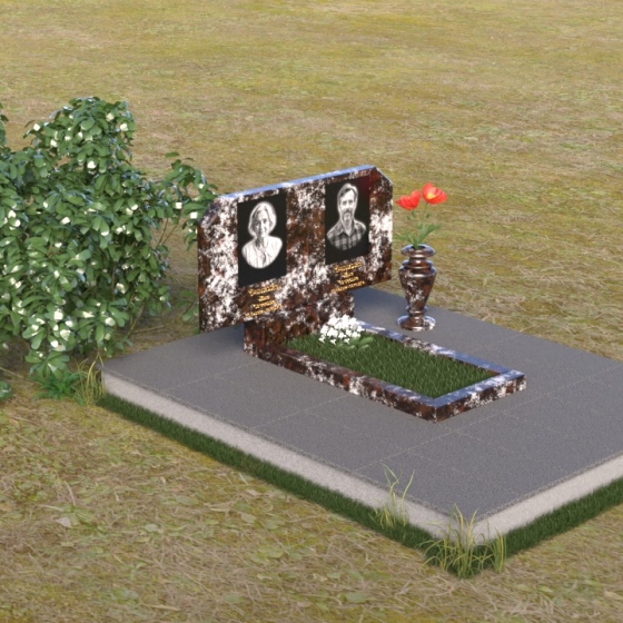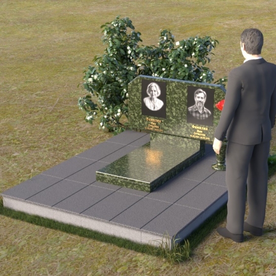 Этот ритуальное изделие (артикул ПГ027) – это не просто надгробный памятник, это способ выразить вашу любовь и уважение к ушедшему близкому человеку. Его строгая, но в то же время элегантная форма, с аккуратно скошенными углами верхней части, символизирует сдержанную скорбь и вечную память. Зеркальная полировка черного камня создает эффект глубины и объема, отражая небо и окружающий мир, словно напоминая о том, что душа усопшего нашла свой покой. Прямоугольная стела, установленная на подставке, выглядит лаконично и достойно. На полированной поверхности отчетливо видны портреты усопших, выгравированные с высокой точностью и детализацией. Композицию завершает ваза из того же материала, в которой можно разместить живые или искусственные цветы, как символ непреходящей любви и памяти. Одинокий красный мак, помещенный в вазу на изображении, служит трогательным акцентом, напоминающим о хрупкости жизни и необходимости ценить каждый момент.