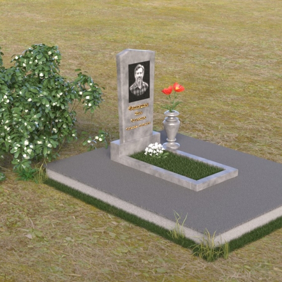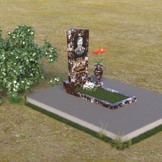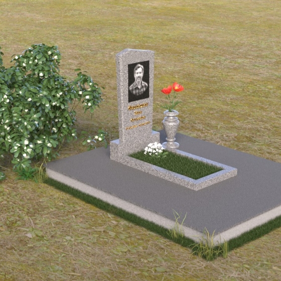 Этот гранитный монумент представляет собой композицию из двух основных элементов: вертикальной плиты с портретом и горизонтальной накладки. Вертикальная плита, возвышающаяся над землей, имеет строгую прямоугольную форму с небольшим скосом в верхней части. Это придает монументу сдержанную элегантность. Зеркальная полировка поверхности отражает свет, создавая ощущение глубины и сияния. На плите выгравирован портрет усопшего, выполненный с высокой точностью и вниманием к деталям. Ниже портрета располагается надпись с именем и датами жизни, выполненная золотым шрифтом. Горизонтальная накладка, расположенная в нижней части, также выполнена из черного полированного гранита и служит своеобразным пьедесталом для вертикальной плиты. Ее гладкая поверхность создает дополнительный контраст с окружающей средой. Рядом с монументом установлена ваза из черного гранита, предназначенная для живых цветов.