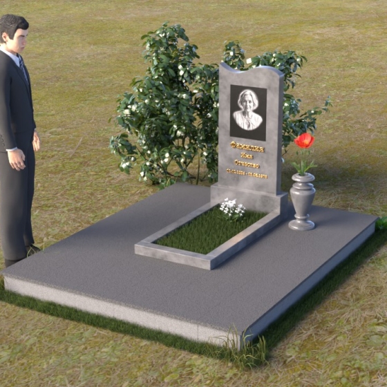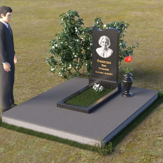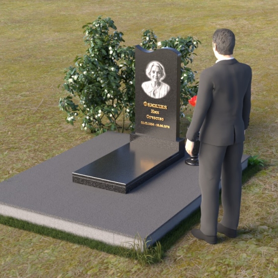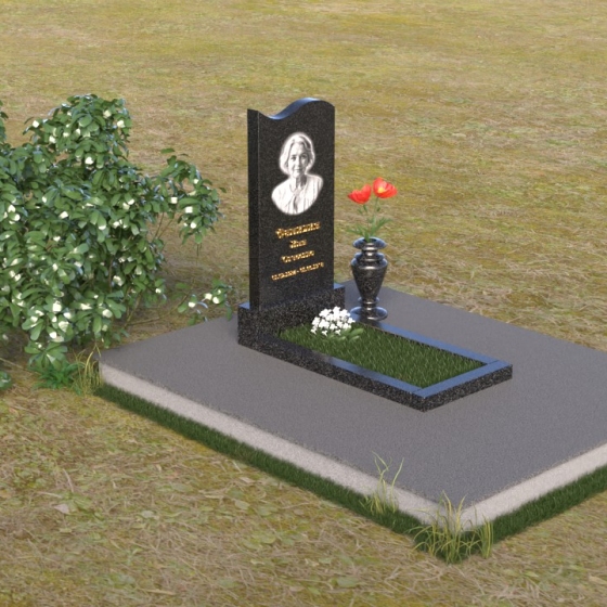 Под стелой располагается горизонтальная плита, также выполненная из полированного гранита, создающая ощущение завершенности и гармонии. Ее зеркальная поверхность отражает небо и облака, словно стирая границу между земным и небесным. Вместе стела и плита образуют единый ансамбль, который органично вписывается в ландшафт, подчеркивая красоту и умиротворение места захоронения. Черный цвет гранита символизирует скорбь и уважение, а его плотная структура гарантирует долговечность и устойчивость к любым погодным условиям. Этот памятник – достойное обрамление памяти о близком человеке, которое будет служить напоминанием о его жизни для будущих поколений.
